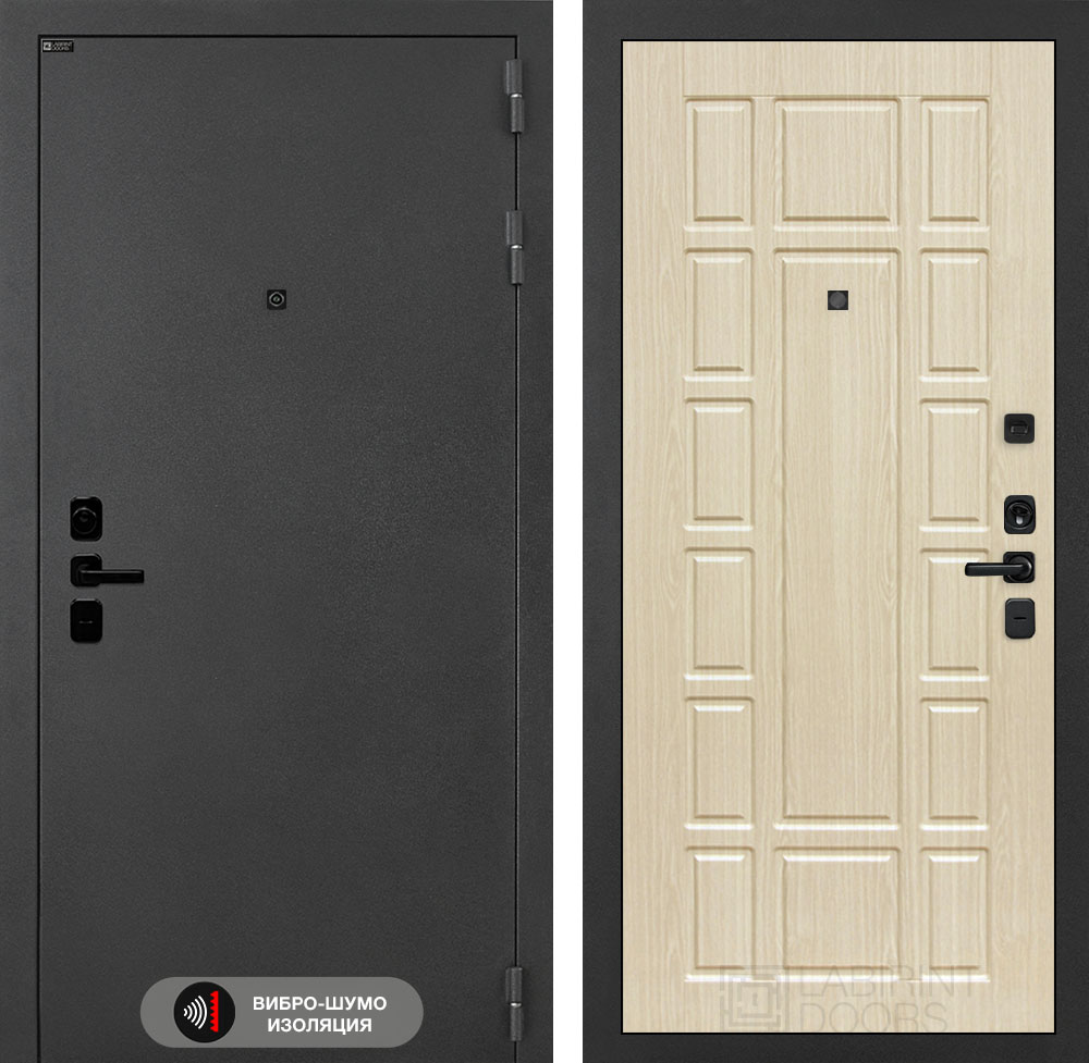 Фурнитура в черном цвете: Броненакладка врезная, накладка со шторкой, глазок , дверная ручка, ночная задвижка. Цилиндр ключ-вертушка (производитель не регламентируется), регулируемый эксцентрик.