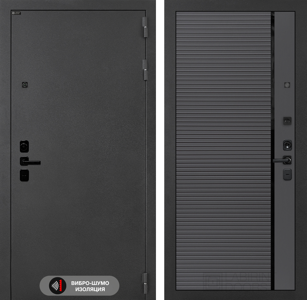 Фурнитура в черном цвете: Броненакладка врезная, накладка со шторкой, глазок , дверная ручка, ночная задвижка. Цилиндр ключ-вертушка (производитель не регламентируется), регулируемый эксцентрик.
