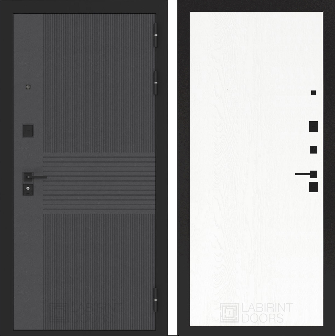 Черная фурнитура (полимерная): накладки сувальдные со шторкой, накладка под цилиндр, дверная ручка, ночная задвижка, металлический эксцентрик с защитной вставкой.