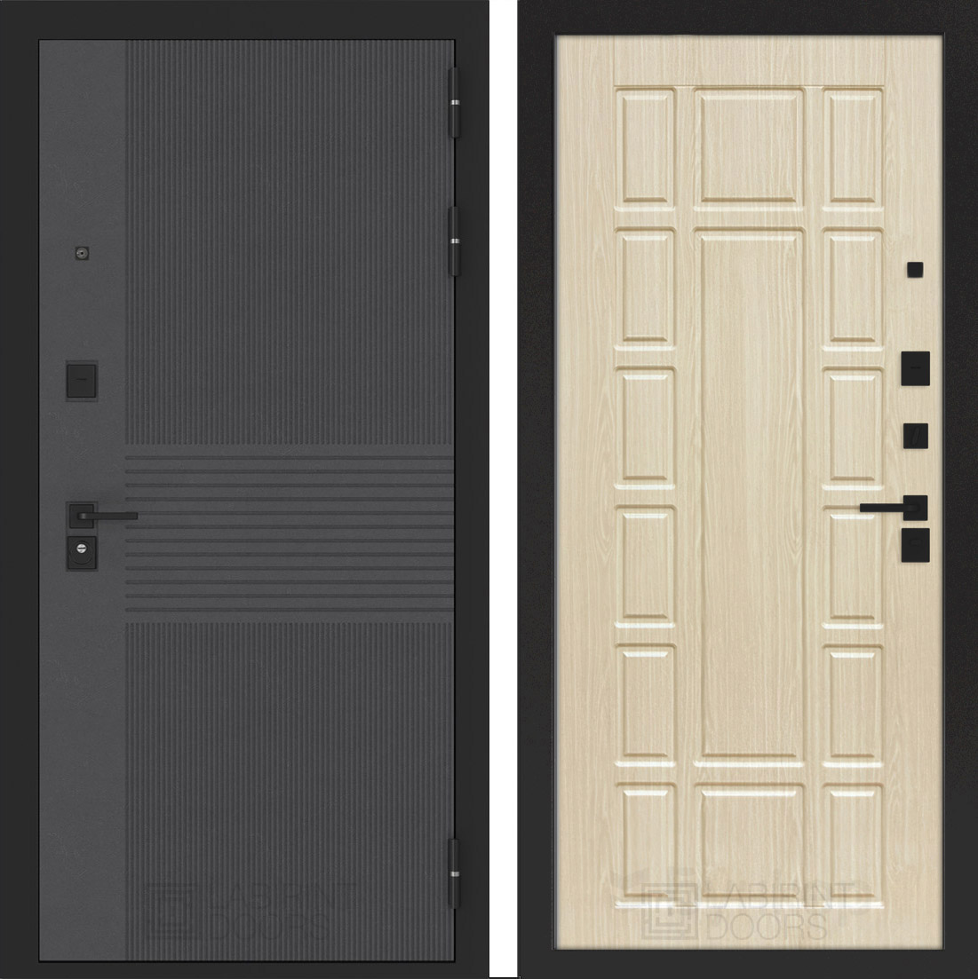 Черная фурнитура (полимерная): накладки сувальдные со шторкой, накладка под цилиндр, дверная ручка, ночная задвижка, металлический эксцентрик с защитной вставкой.