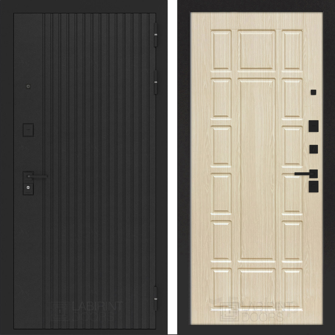Черная фурнитура (полимерная): накладки сувальдные со шторкой, накладка под цилиндр, дверная ручка, ночная задвижка, металлический эксцентрик с защитной вставкой.