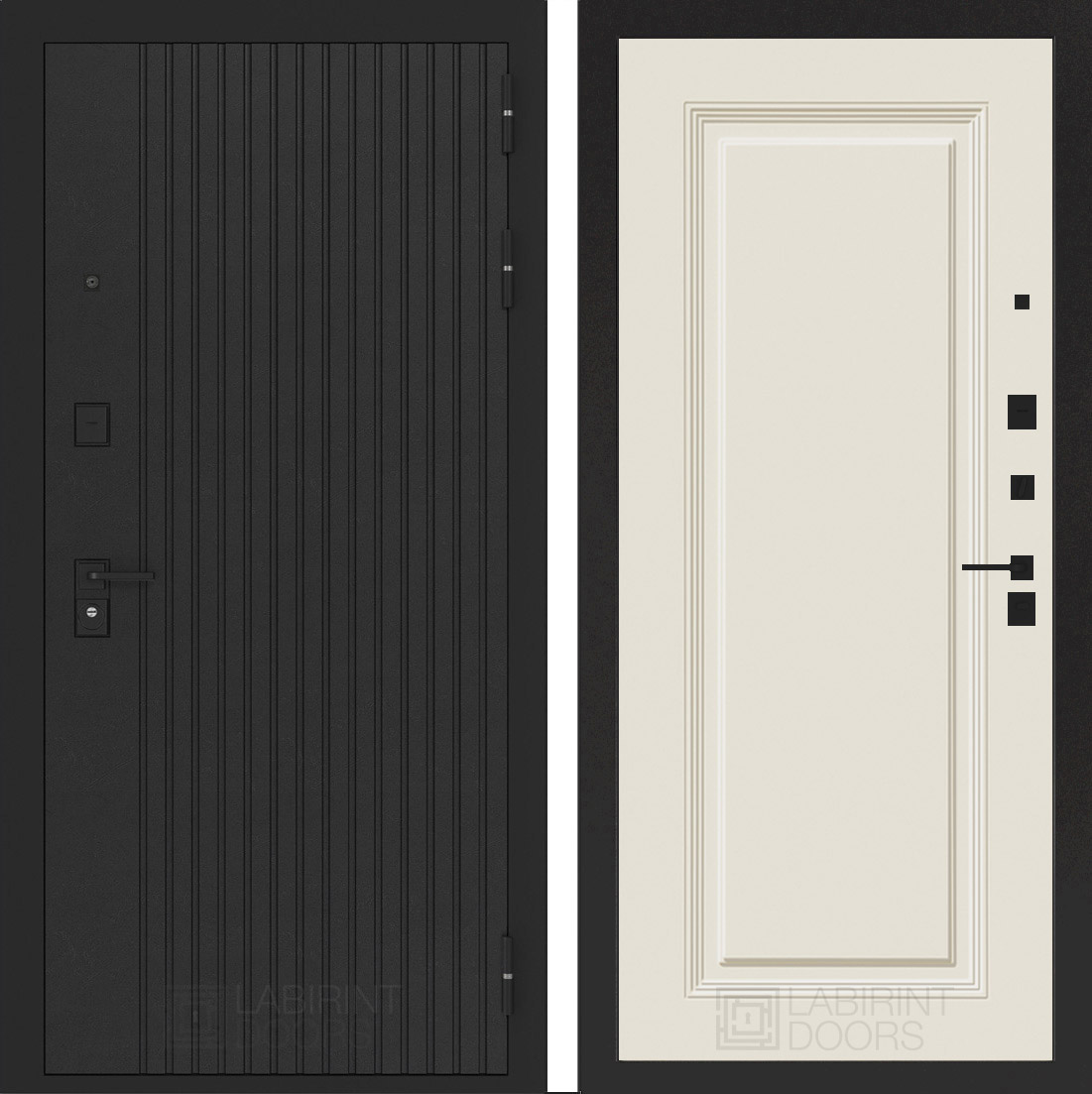Черная фурнитура (полимерная): накладки сувальдные со шторкой, накладка под цилиндр, дверная ручка, ночная задвижка, металлический эксцентрик с защитной вставкой.
