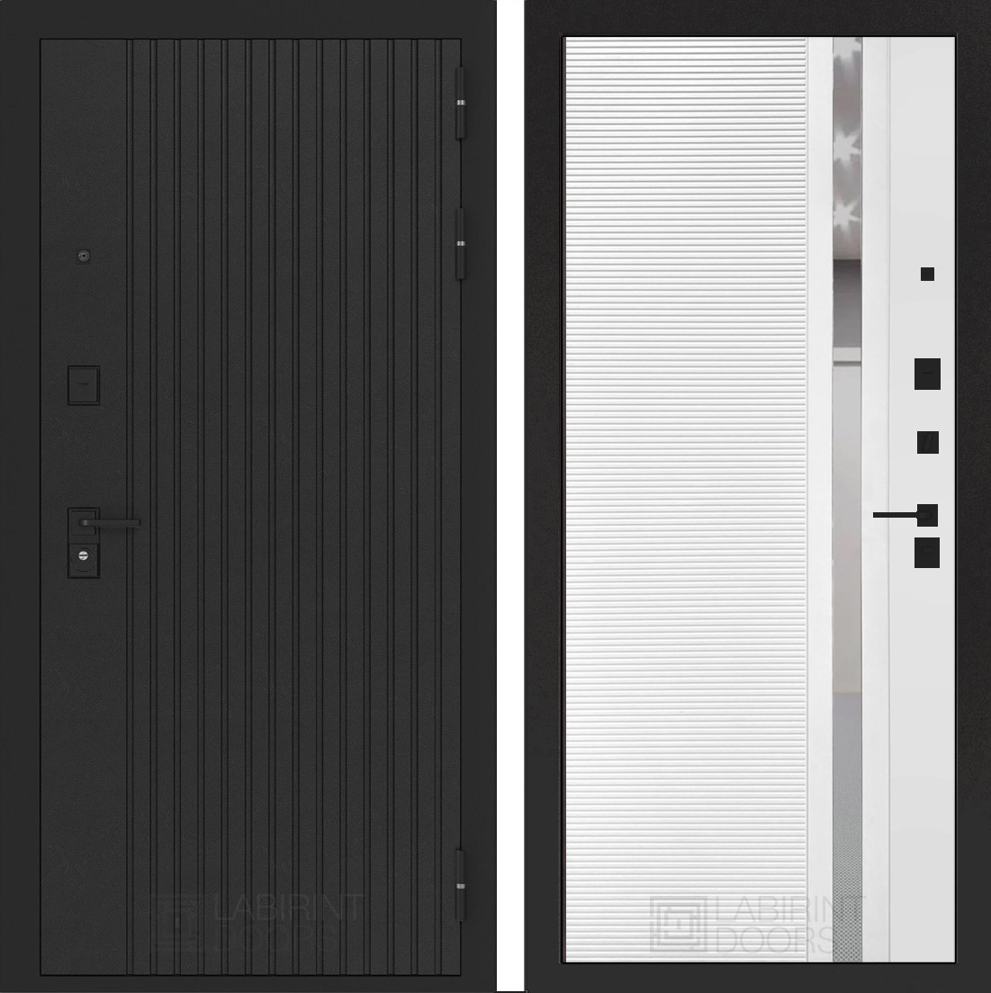 Черная фурнитура (полимерная): накладки сувальдные со шторкой, накладка под цилиндр, дверная ручка, ночная задвижка, металлический эксцентрик с защитной вставкой.