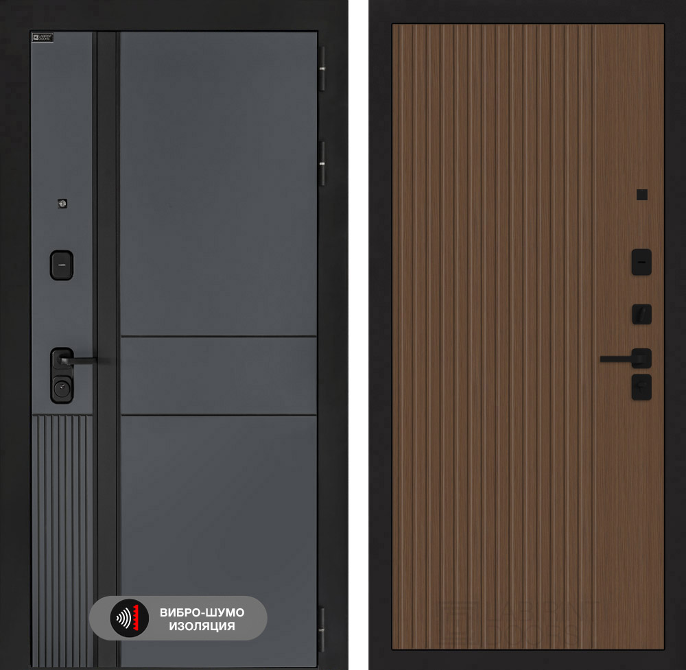 Фурнитура в черном цвете: Броненакладка врезная, накладка со шторкой, глазок , дверная ручка, ночная задвижка. Цилиндр ключ-вертушка (производитель не регламентируется), регулируемый эксцентрик.