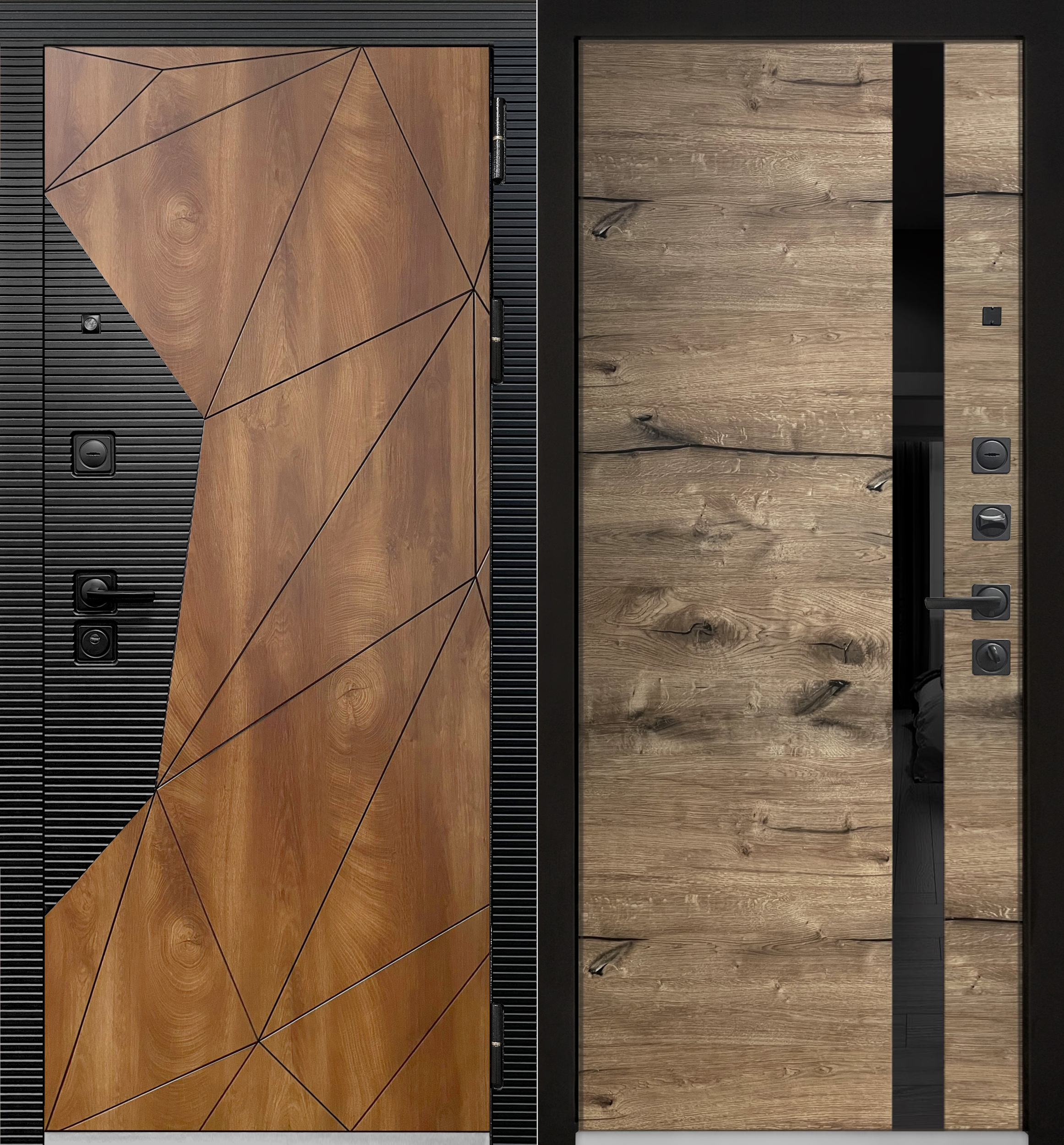 Объёмная комбинированная МДФ панель 10 мм, экошпон Дуб коньяк с вековыми кольцами и патиной, горизонт фреза  экошпон Кварц чёрный.