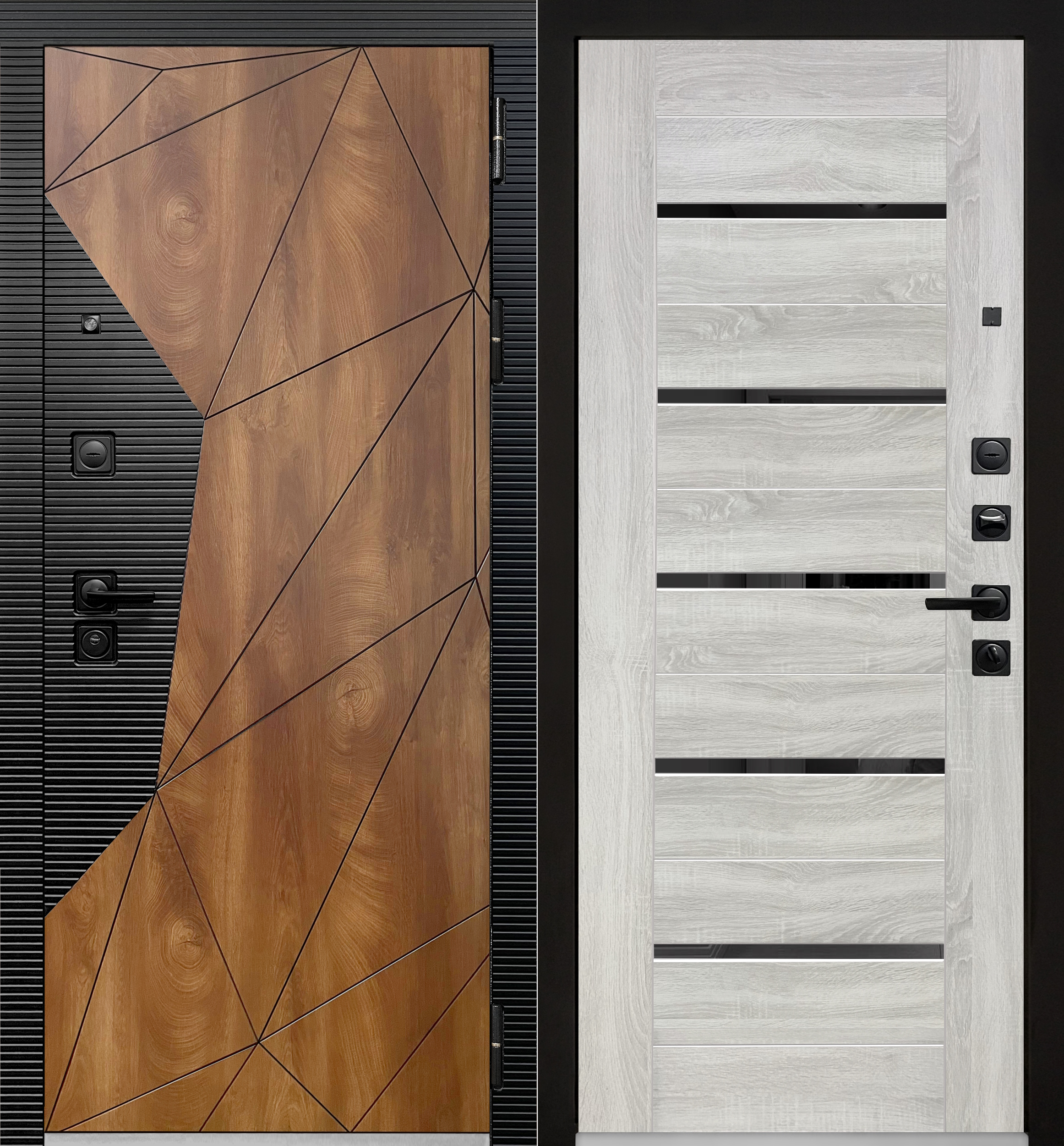 Объёмная комбинированная МДФ панель 10 мм, экошпон Дуб коньяк с вековыми кольцами и патиной, горизонт фреза  экошпон Кварц чёрный.