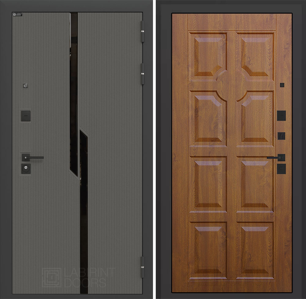 Фурнитура в черном цвете: Броненакладка врезная, накладка со шторкой, глазок , дверная ручка, ночная задвижка. Цилиндр ключ-вертушка (производитель не регламентируется), регулируемый эксцентрик.