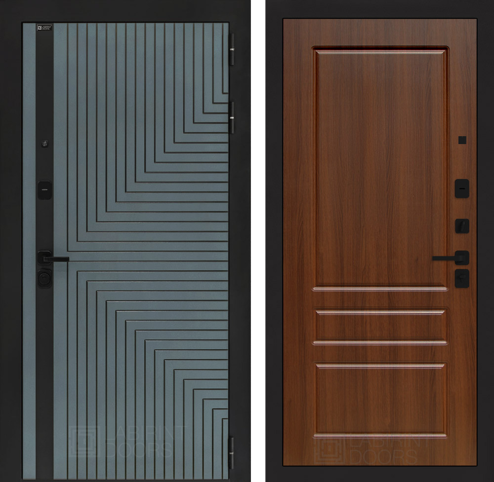 Фурнитура в черном цвете: Броненакладка врезная, накладка со шторкой, глазок , дверная ручка, ночная задвижка. Цилиндр ключ-вертушка (производитель не регламентируется), регулируемый эксцентрик.