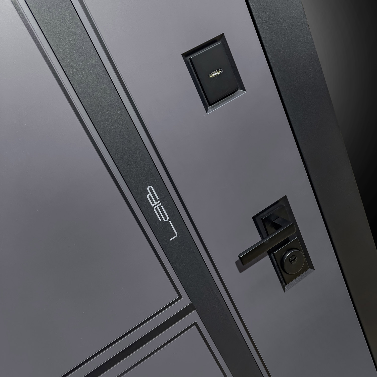 Фурнитура в черном цвете: Броненакладка врезная, накладка со шторкой, глазок , дверная ручка, ночная задвижка. Цилиндр ключ-вертушка (производитель не регламентируется), регулируемый эксцентрик.