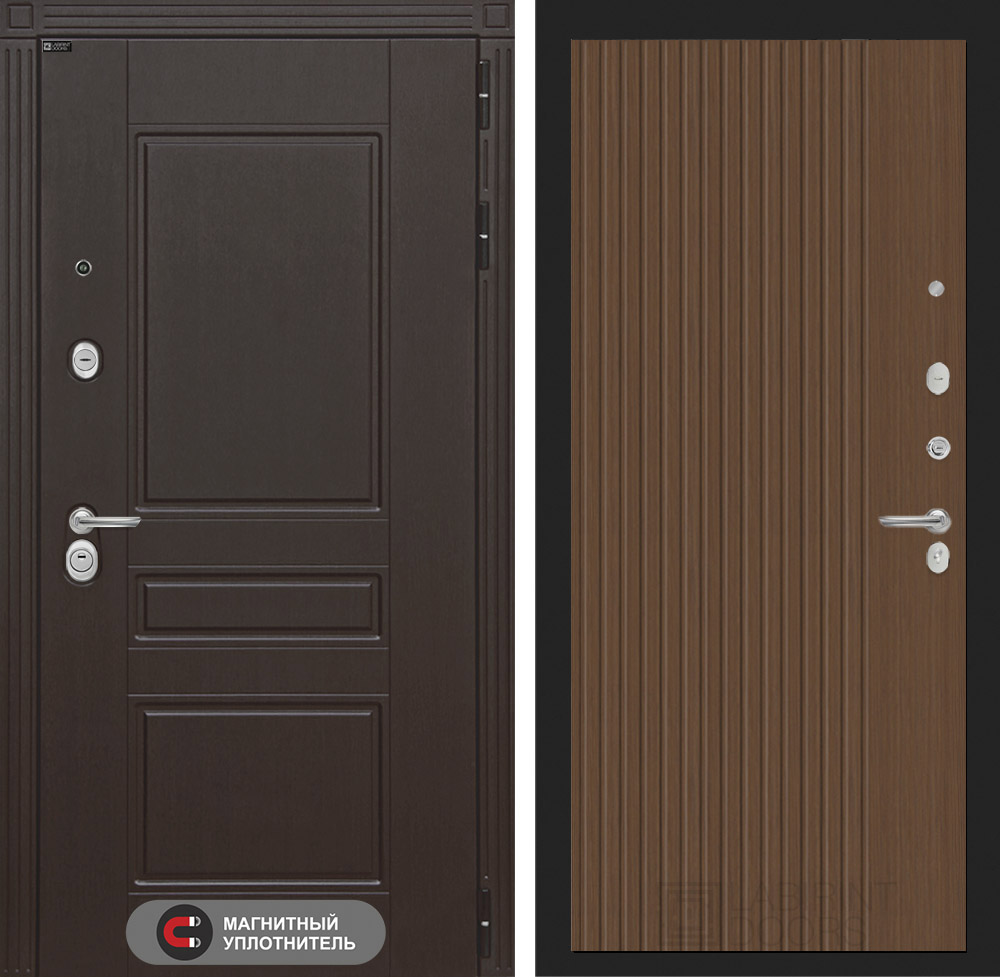 Броненакладка врезная, накладка со шторкой, глазок , дверная ручка, ночная задвижка, цилиндр ключ-вертушка (производитель не регламентируется), регулируемый эксцентрик.