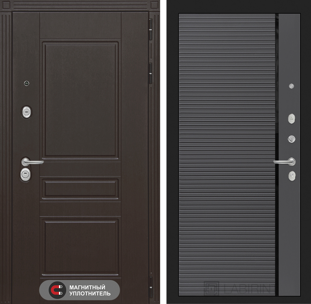 Броненакладка врезная, накладка со шторкой, глазок , дверная ручка, ночная задвижка, цилиндр ключ-вертушка (производитель не регламентируется), регулируемый эксцентрик.