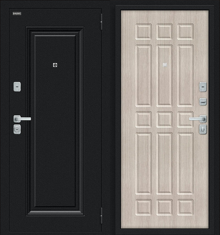 Семь усиливающих уголков и защитный карман для замков. Дополнительную стойкость ко взлому обеспечивают два противосъемных штыря.