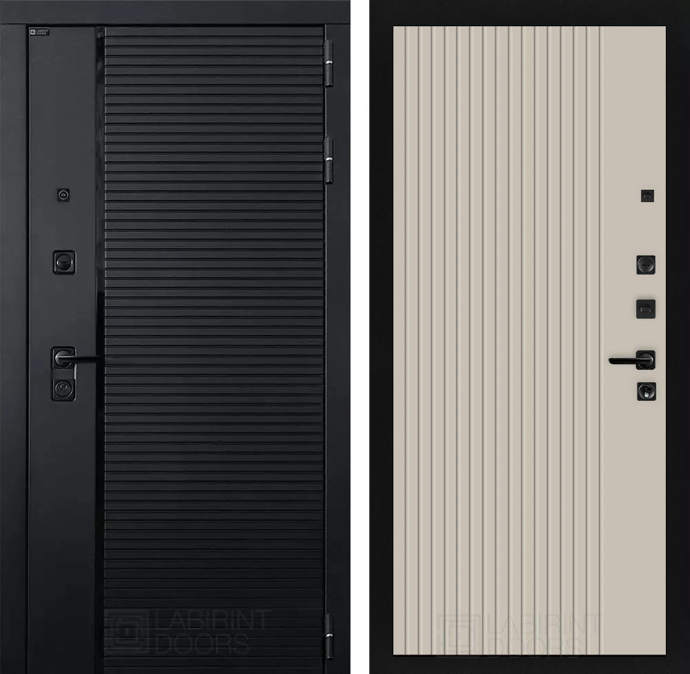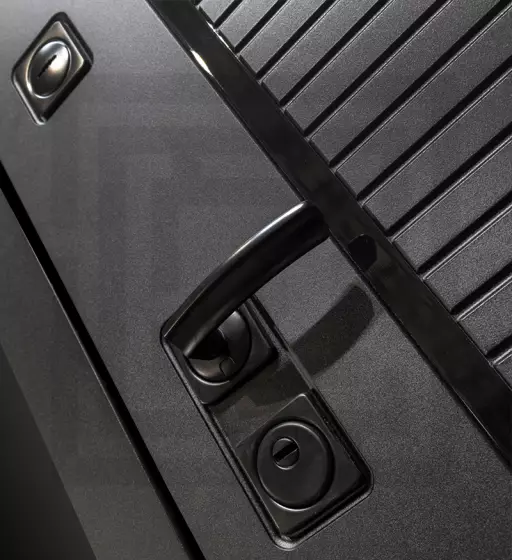 Фурнитура в черном цвете: Броненакладка врезная, накладка со шторкой, глазок , дверная ручка, ночная задвижка. Цилиндр ключ-вертушка (производитель не регламентируется), регулируемый эксцентрик.