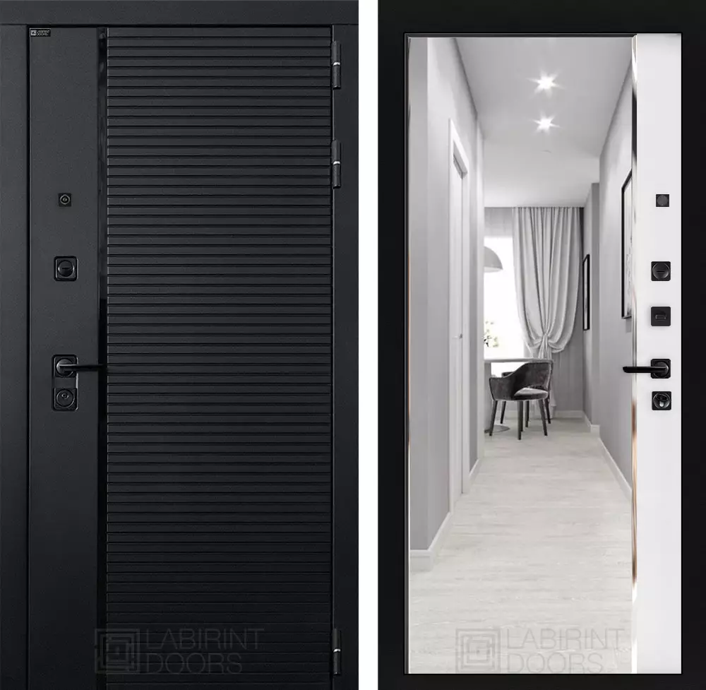 Фурнитура в черном цвете: Броненакладка врезная, накладка со шторкой, глазок , дверная ручка, ночная задвижка. Цилиндр ключ-вертушка (производитель не регламентируется), регулируемый эксцентрик.