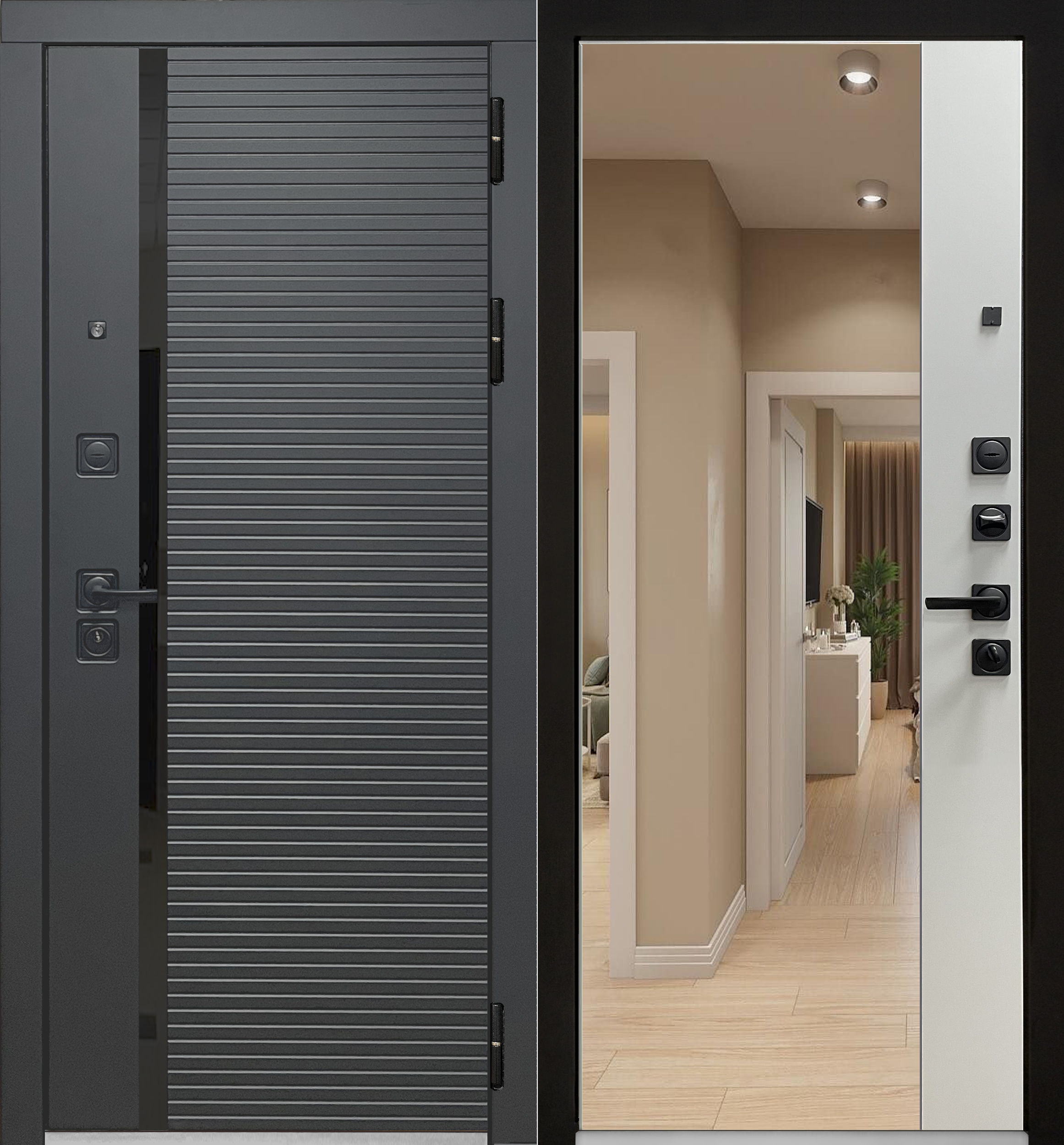 Объемная МДФ панель 10 мм, экошпон Черный Кварц. Комбинирование горизонтальной фрезеровки с вертикальной вставкой из черного стекла "Лакобель" и гладкой поверхностью.