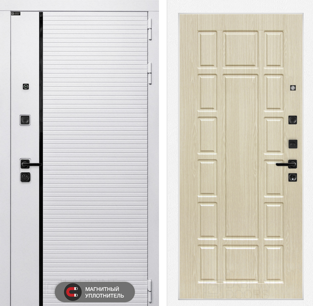 Фурнитура в черном цвете: Броненакладка врезная, накладка со шторкой, глазок , дверная ручка, ночная задвижка. Цилиндр ключ-вертушка (производитель не регламентируется), регулируемый эксцентрик.