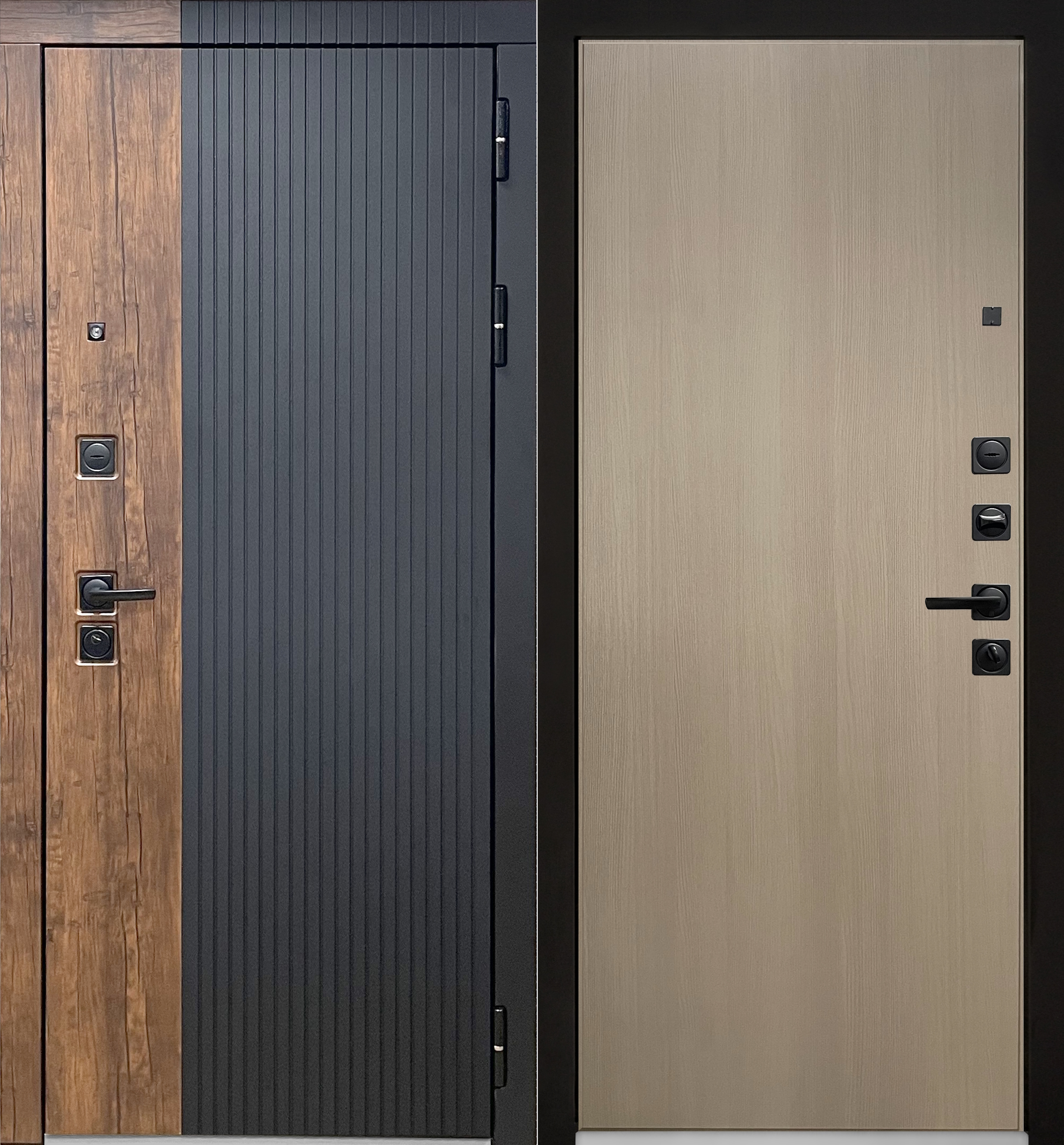 Объёмная комбинированная МДФ панель 10 мм, экошпон Дуб Кантри с патиной, вертикальная фреза  экошпон Кварц черный.