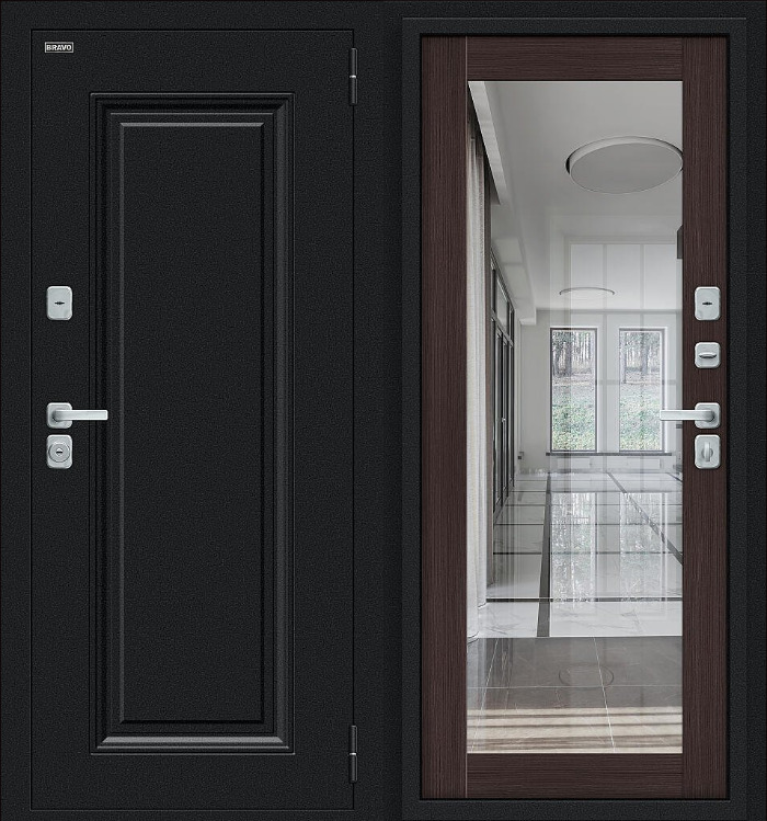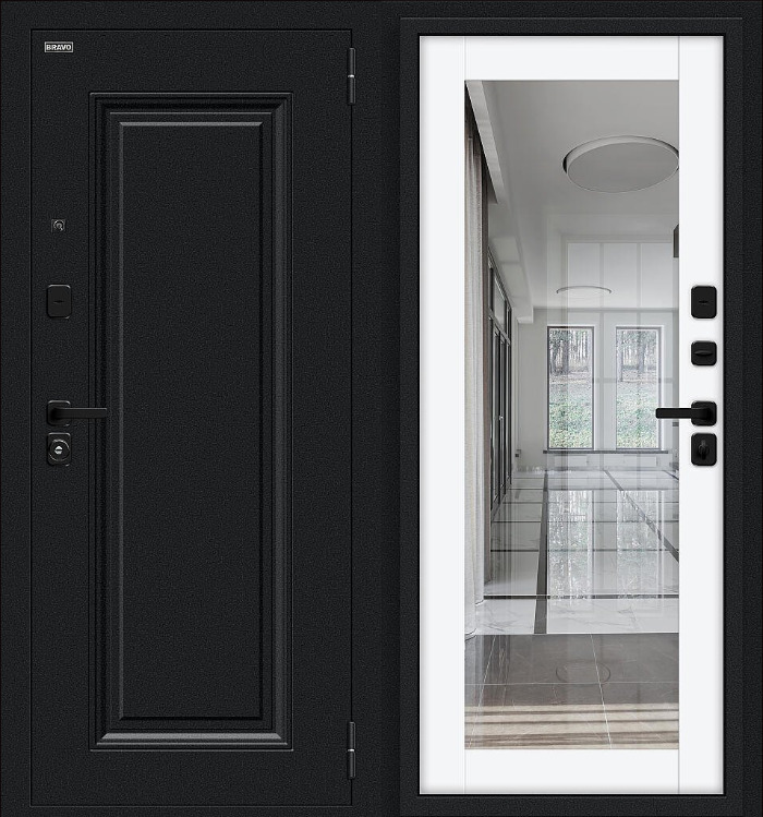 Стальной дверной блок энергосберегающей конструкции с двойным терморазрывом (термомостом) из натуральной пробки, четырехконтурным уплотнением и уникальным цилиндром с термоштоком. Поставляется с правым и левым открыванием наружу.