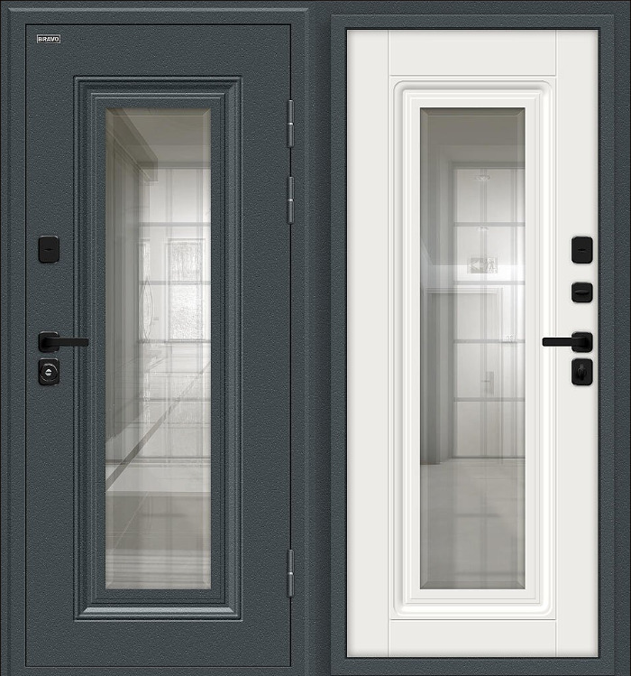 Стальной дверной блок энергосберегающей конструкции с двойным терморазрывом (термомостом) из натуральной пробки и четырехконтурным уплотнением. Поставляется с правым и левым открыванием наружу.